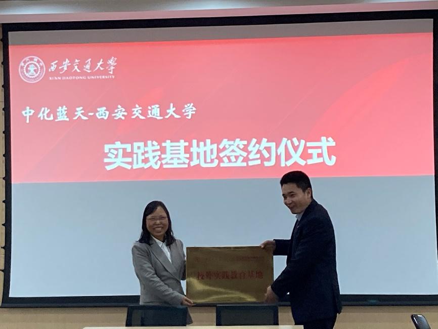 副院长张彦峰与中化蓝天人力资源部副总经理李媛签署了西交大校外实践教育基地,并进行了授牌仪式,现场气氛热烈,大家对更深层次的校企合作抱有极大的期盼。