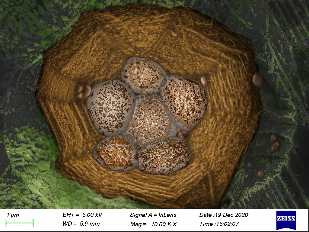 学生作品《巢》是基于铜锌合金高温煅烧后薄膜样品的扫描电镜原图,利用Photoshop软件,通过抠图、调色、阴影、高光增加了色彩和立体感,用苔藓、鸟巢、鸟蛋、蘑菇四种元素描绘了一幅雨后林中鸟巢静待的画面,鸟蛋的诞生、挫折、等待、破壳的生命历程与科研之路是相似的,喻示了科研工作者坚韧不拔、心怀希望的美好品质。