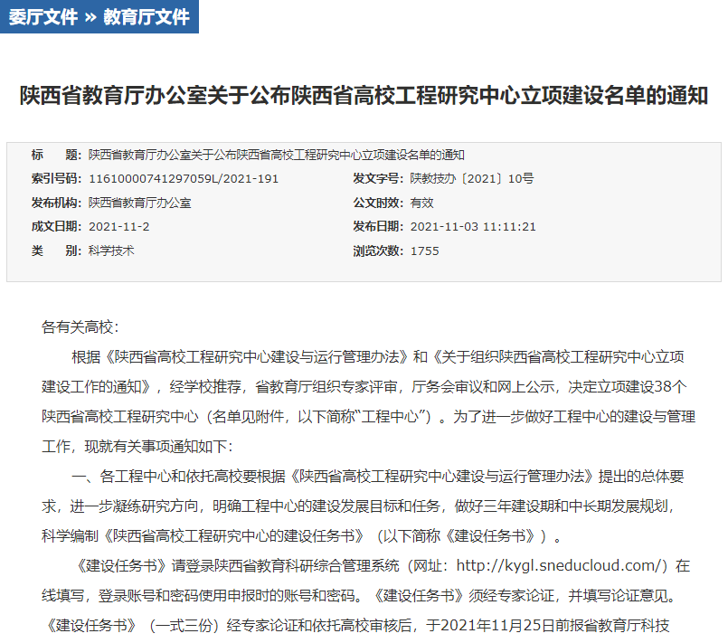 11月2日,陕西省教育厅发文公布首批陕西省高校工程研究中心立项建设名单。由幸运飞艇开奖网