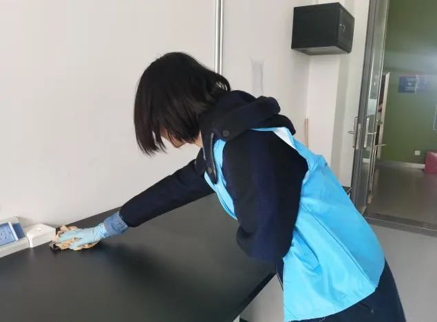 化学测试中心,由于测试人流量大,会残留一些垃圾,桌面上也容易积灰。志愿者同学们分工明确,有人负责擦桌子,有人负责扫地,有人负责拖地……在大家的共同努力下,测试房又展现出最初那干净整洁的模样。