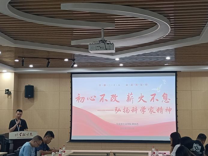 辅导员梁佳艺老师,作主题分享“初心不改,薪火不息——弘扬科学家精神”。他以习近平总书记在主持召开科学家座谈会上发表的讲话开启主题,强调了“科学无国界,科学家有祖国”的重要论述,播放了邓稼先、钱学森、袁隆平等为国家做出突出贡献科学家的纪录片。梁老师字句铿锵,他一心为国的精神着实令人敬佩,同时归纳总结了爱国、创新、求实、奉献、协同、育人的科学家的精神内涵,最后鼓励大家,在爱国的集体里做乐观的英雄!