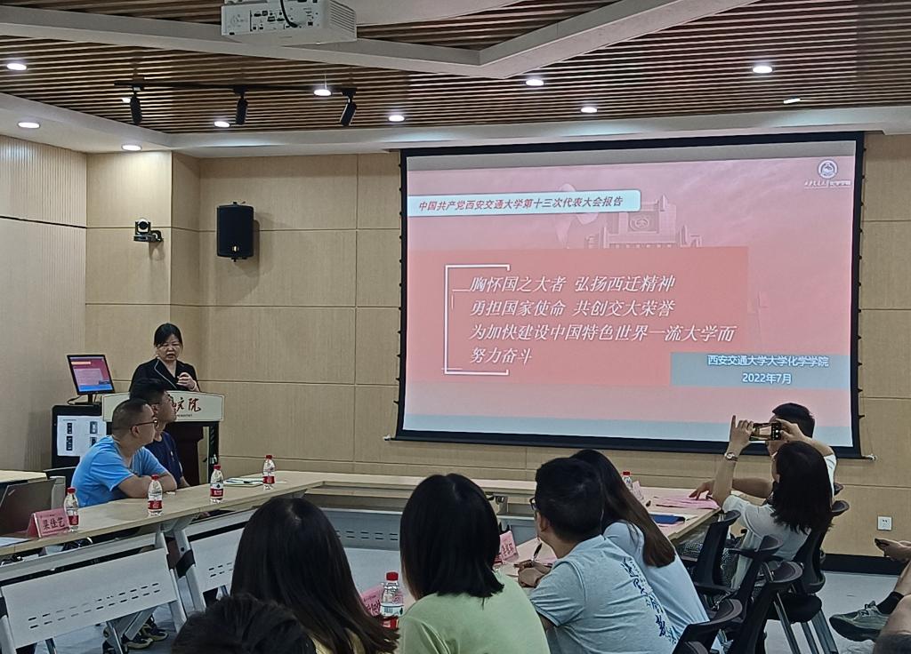 党委委员李银环教授带领学习《中共西安交通大学第十三次代表大会报告》,她高度总结了十二次党代会以来“五个坚定不移”的主要工作以及”九个坚持“的宝贵经验,提醒大家深刻认识和把握面临的形式任务和奋斗目标的“三个必须”以及未来五年重点任务目标的“九个更加”,强调坚持和加强党对学校工作的全面领导推动学校内涵式教育高质量发展。最后寄语,胸怀国之大者,弘扬西迁精神,勇担国家使命、共创交大荣誉、为加快建设中国特色世界一流大学而努力奋斗!