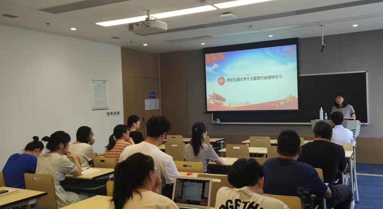 党委常委梁军艳老师带领大家学习了西安交通大学十三届党代会精神。梁老师介绍了大会主题是高举习近平新时代中国特色社会主义思想伟大旗帜,深入学习贯彻党的十九大和十九届历次全会精神,全面贯彻习近平总书记来校考察重要讲话精神,牢记为党育人、为国育才使命,落实立德树人根本任务,胸怀“国之大者”, 弘扬西迁精神,勇担国家使命,共创交大荣誉,加快建设中国特色世界一流大学,以实际行动坚决拥护“两个确立”、坚决做到 “两个维护”,为全面建设社会主义现代化国家做出更大贡献。梁老师还介绍了我校第十二次党代会以来的主要工作及取得成绩,宣传了我校未来五年的任务目标以及方案措施。分享结束之际,梁老师呼吁大家站在新的发展起点上,要更加紧密地团结在以习近平同志为核心的党中央周围,弘扬西迁精神,勇担国家使命,共创交大荣誉,为实现第二个百年奋斗目标、实现中华民族伟大复兴的中国梦做出新的卓越贡献。
