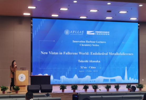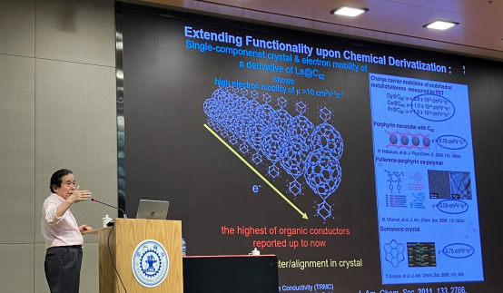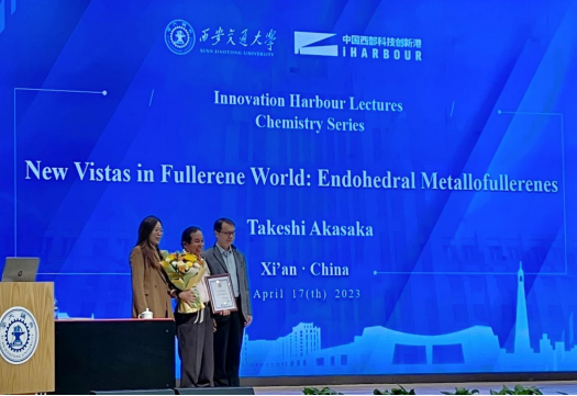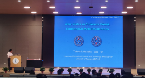 伴随着现场热烈的掌声,化学系列首场新港报告正式开讲,报告围绕金属富勒烯研究的不同方向展开系统性介绍,赤阪 健教授向听众阐述了新型内嵌金属富勒烯的分子设计、结构表征、独特的离子模型、物理化学性质以及它们在电子学、有机光伏电池、生物医学以及材料科学等领域的潜在应用。