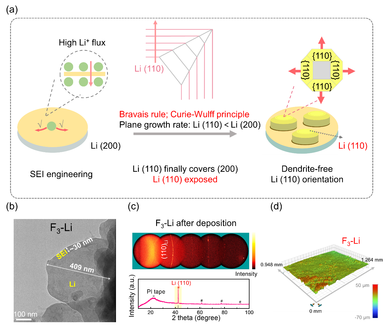 针对以上问题,西安交通大学丁书江教授、肖春辉教授课题组通过设计高通量固态电解质界面(SEI),诱导Li(110)取向的锂沉积,实现了无枝晶锂金属电池。如图1所示,通过简单高效的SEI工程,采用CF3Si(CH3)3(F3)滴涂策略,有效诱导高LiF和-Si(CH3)3含量的高通量SEI(F3-SEI)。加速了Li+的传输动力学,确保SEI下的高的Li+浓度,有利于的Li(110)取向。通过Bravais规则和Curie-Wulff原理,解耦了SEI工程与锂电结晶择优取向之间的关系。多光谱技术与动力学分析表明,诱导的Li(110)晶面进一步促进了Li原子的表面迁移,避免尖端聚集,从而形成了平面的、无枝晶的Li沉积。F3-SEI使Li||Li对称电池能够长期稳定336天以上。F3-SEI也能显著提高Li||LiFePO4和Li|||NCM811扣式电池和软包电池的循环寿命。该工作对从晶体学角度抑制Li枝晶提供新的思路,促进性能优异的LMBs的发展,也为其他金属晶体的择优取向提供一定的指导。