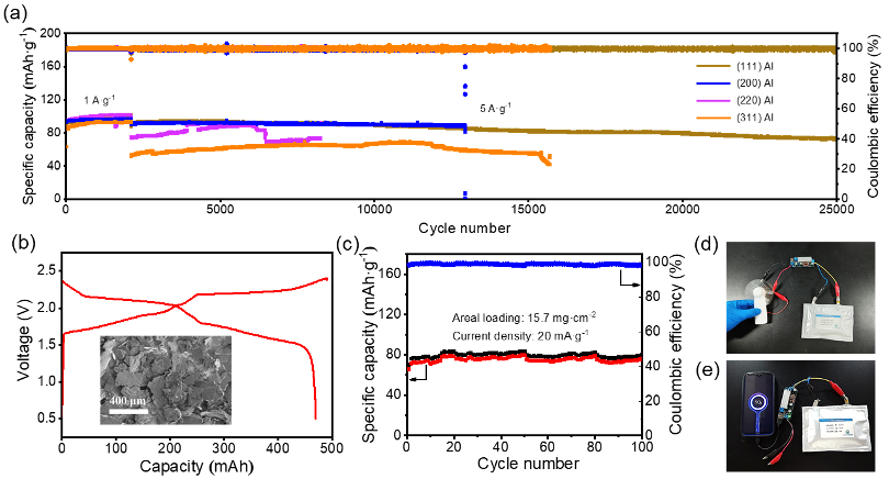 图2. 不同择优晶面铝负极组装的世伟洛克电池和软包电池的循环性能