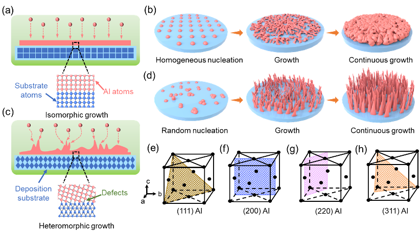 图1. 铝电池负极同构生长和异构生长模式的电沉积示意图