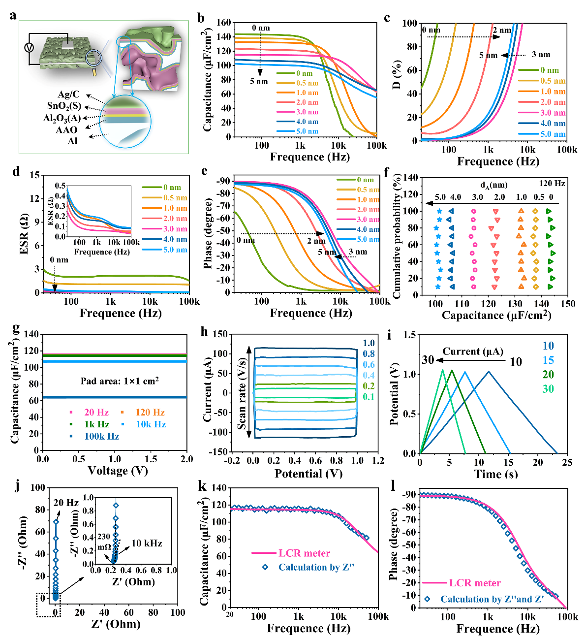图2. Al/Ag/C/SA/AAO/Al电容器的电容、损耗、ESR和相位角随频率变化的特性,以及CV曲线、充放电曲线和阻抗谱测试。
