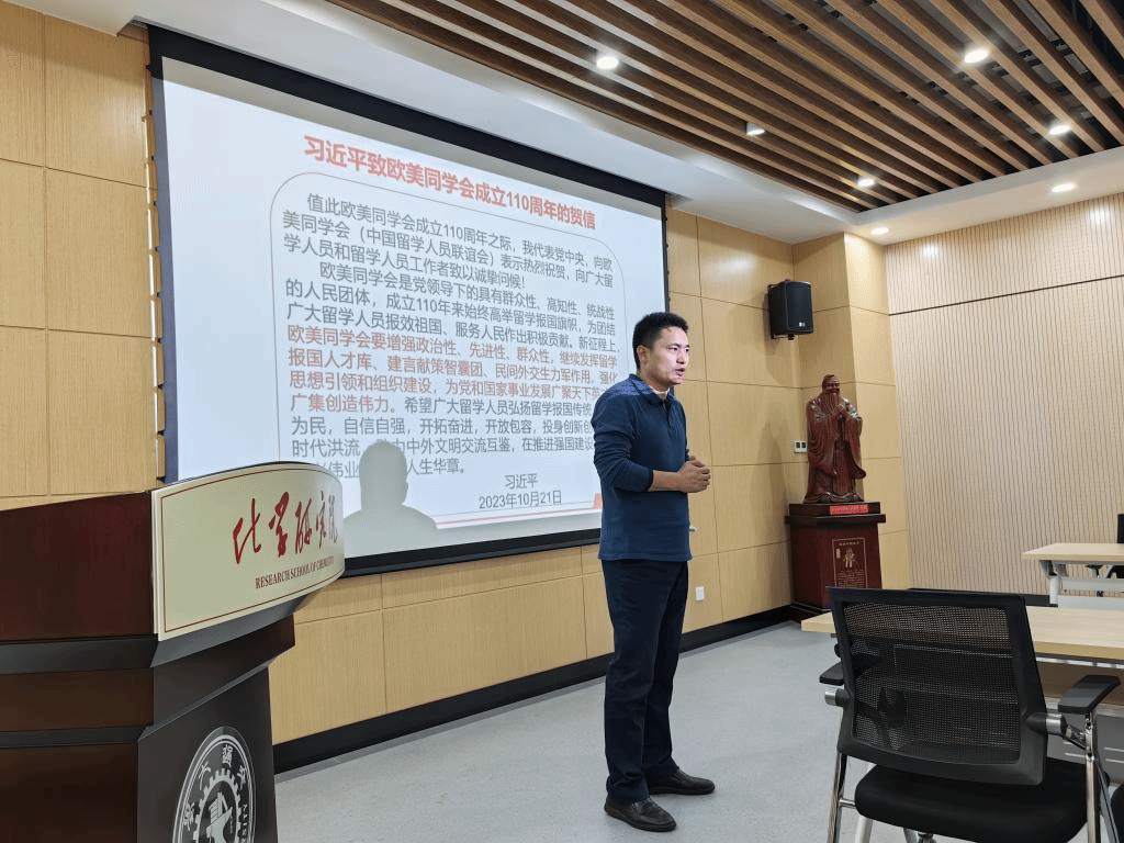 会议第一项,党支部书记张彦峰同志带领全体党员同志学习《习近平致欧美同学会成立110周年的贺信》。张彦峰书记首先讲述了欧美同学会的历史及其重要精神,号召党员同志弘扬留学报国精神,爱国为民,自信自强,开拓奋进。