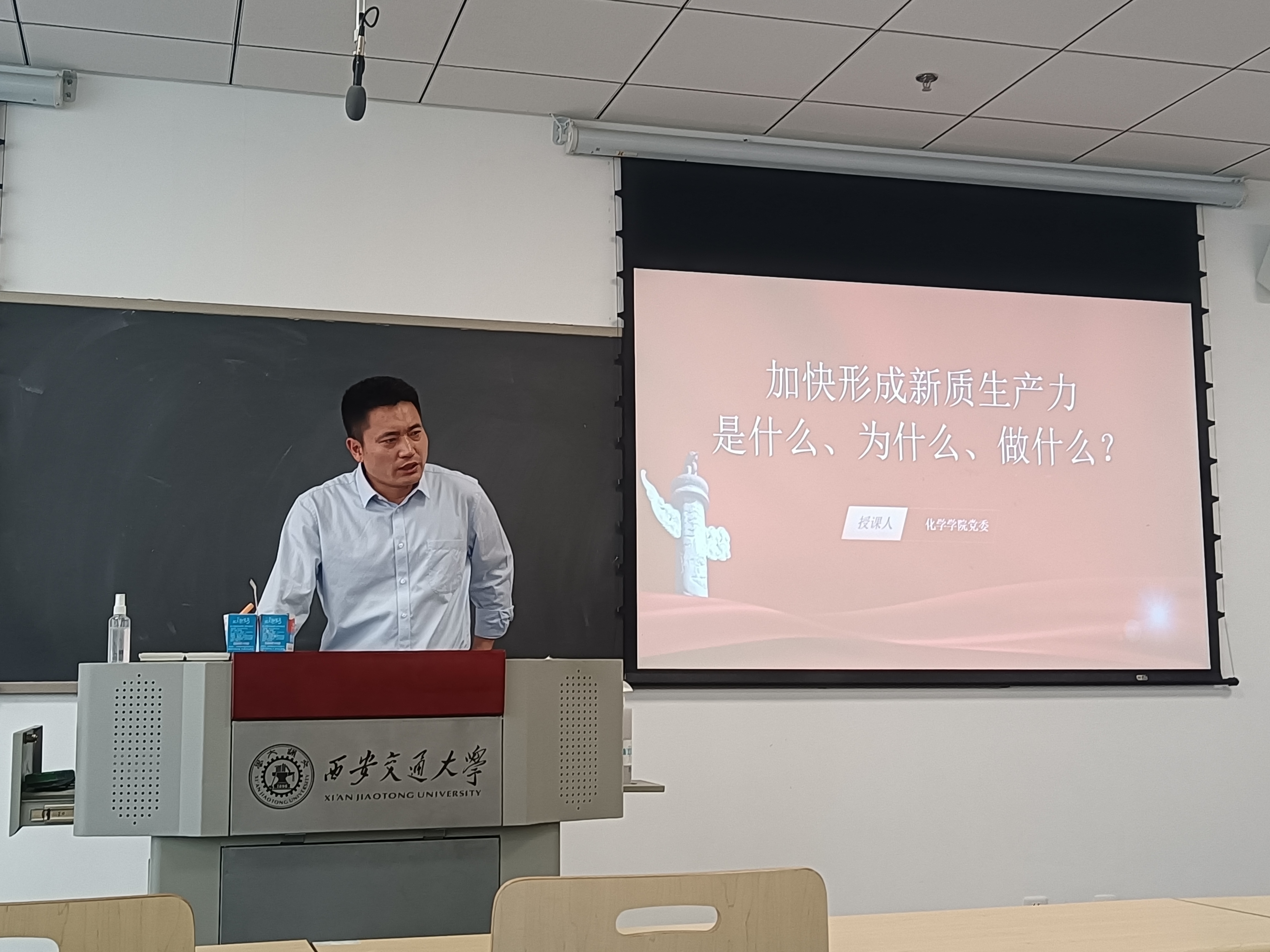 副院长张彦峰老师为党员同志讲党课,课程主题为“加快形成新质生产力,是什么、为什么、做什么”。张彦峰副院长不仅讲述了新质生产力是什么,还深入浅出地解释了新质生产力的深刻内涵、主要特征等方面,对于研究生党员,张院长更是关于职业规划、未来选择提出自己衷心的建议。